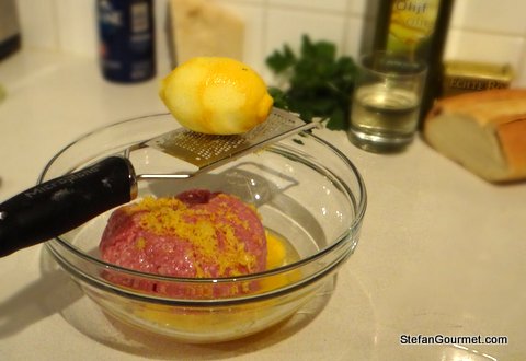 Disponete in una ciotola la carne macinata, le uova, il prezzemolo, la mollica di pane, il parmigiano, la buccia grattugiata e il sale.