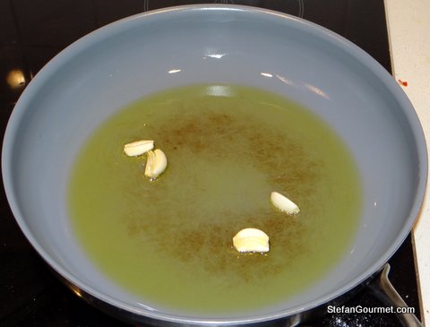 Scaldate l’olio in una padella antiaderente con gli spicchi d’aglio sbucciati.