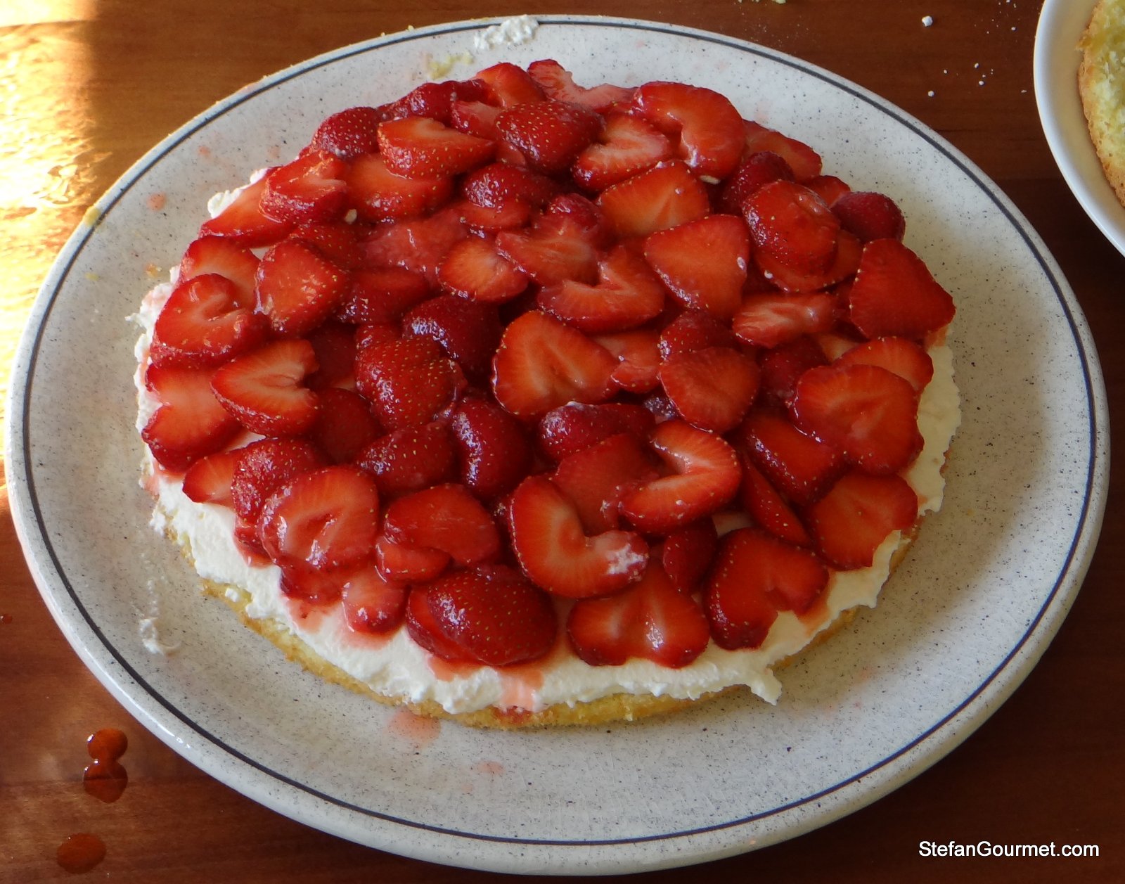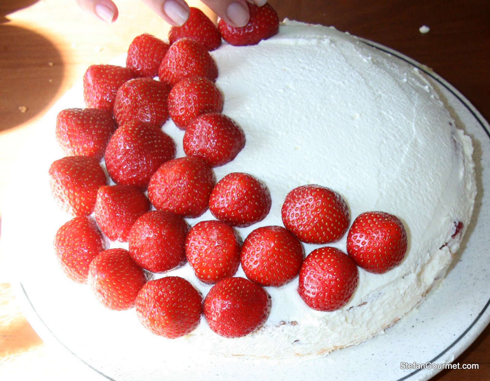 Coprite la torta con panna montata, anche i lati. Disponete sopra le fragole belle.