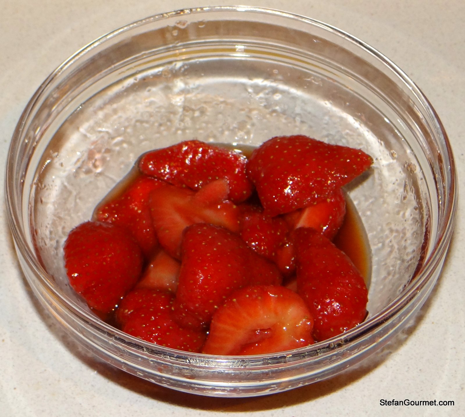 Affettate le fragole rimaste e fatele macerare per mezz’ora con l’aceto balsamico e il miele, mescolatele di tanto in tanto.