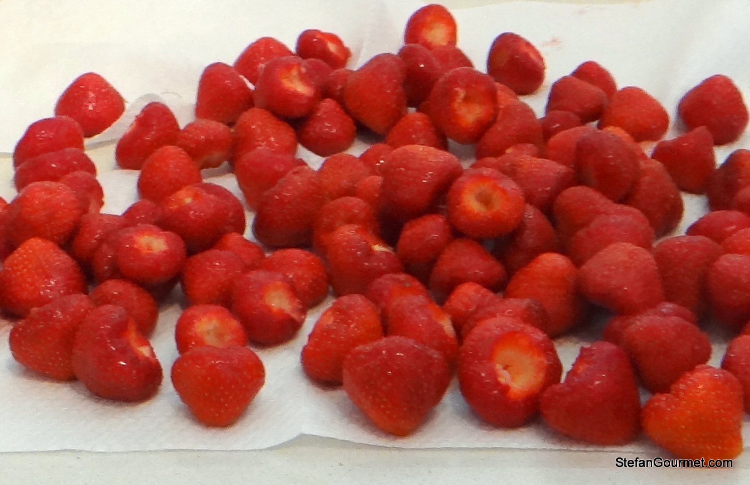 Nel frattempo lavate le fragole, togliete le corone verdi e poi tamponatele con carta da cucina. Tenete da parte abbastanza fragole belle per coprire la parte superiore della torta.