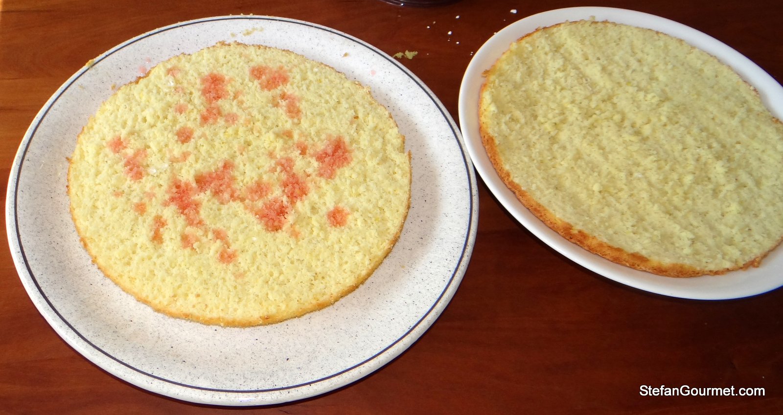Con un coltello dalla lama lunga dividete il pan di spagna. Inzuppate i due strati con lo sciroppo ottenuto dalle fragole macerate.