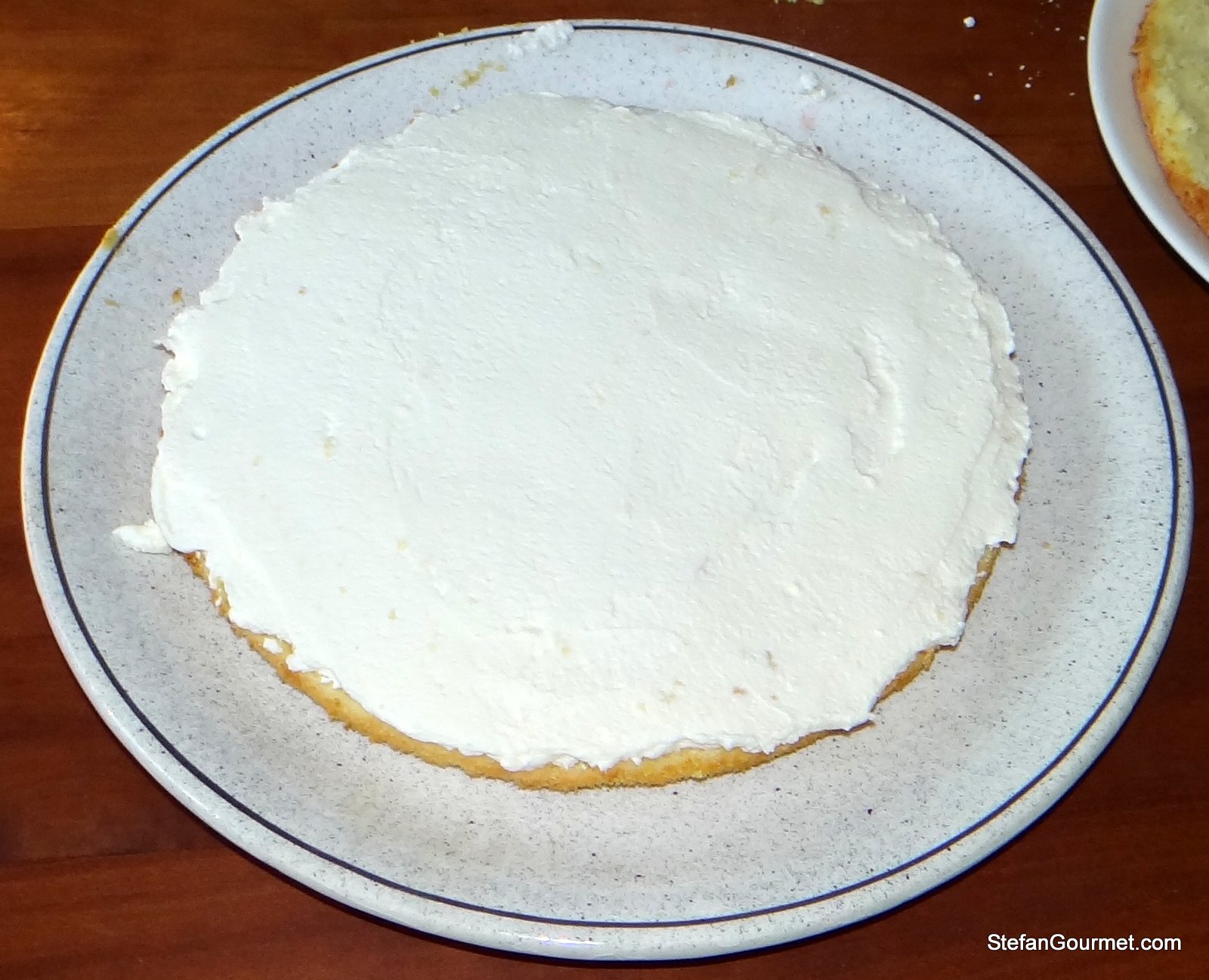 Montate la panna con lo zucchero vanigliato. Spalmate il primo strato con panna montata.