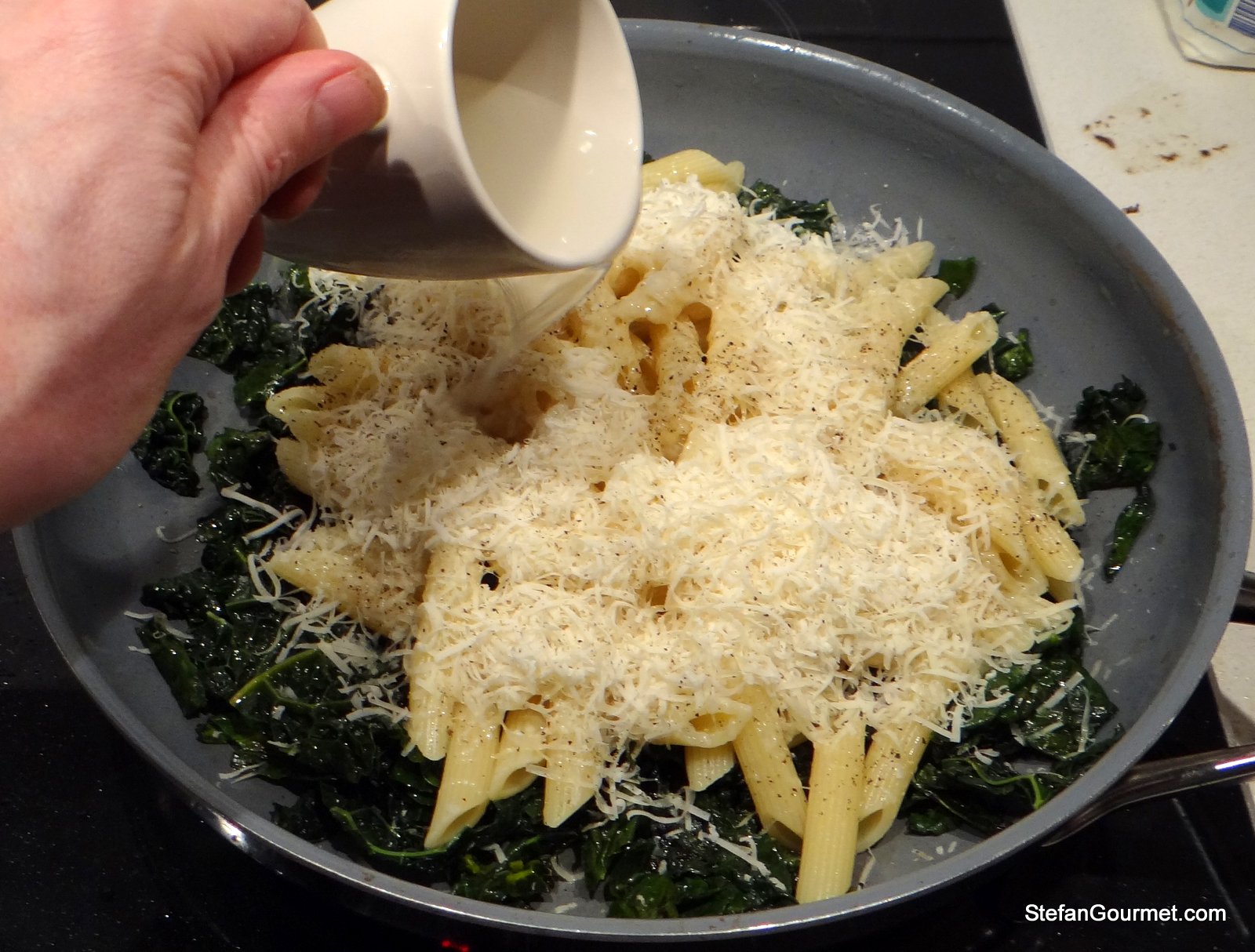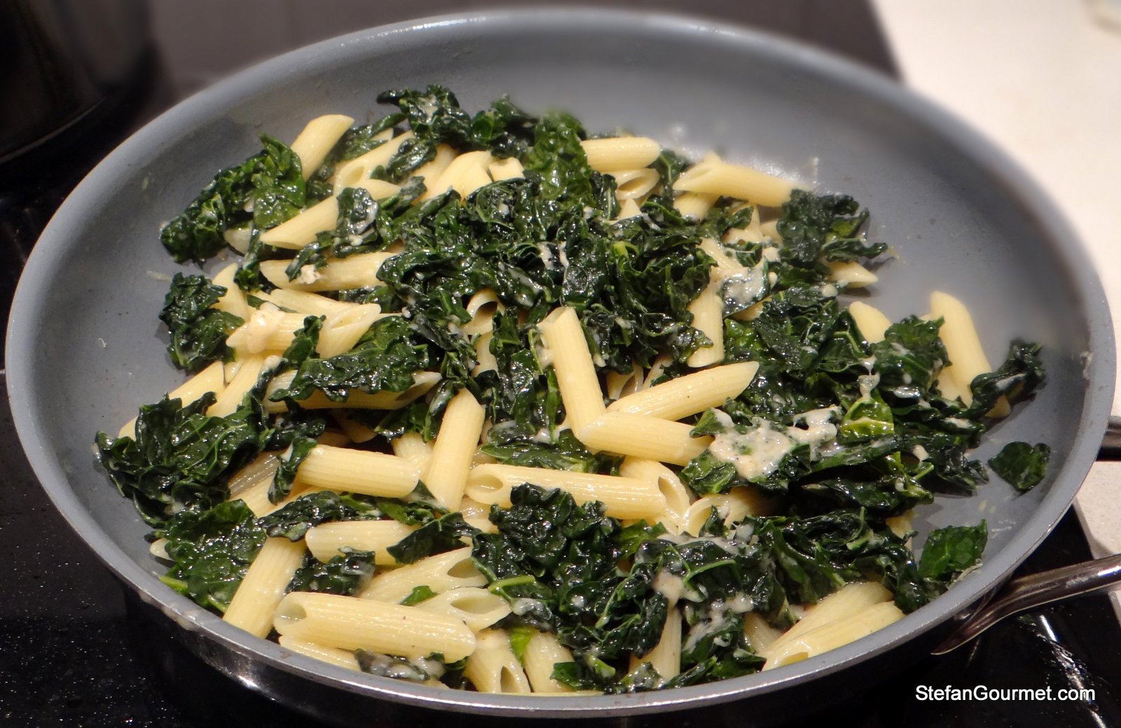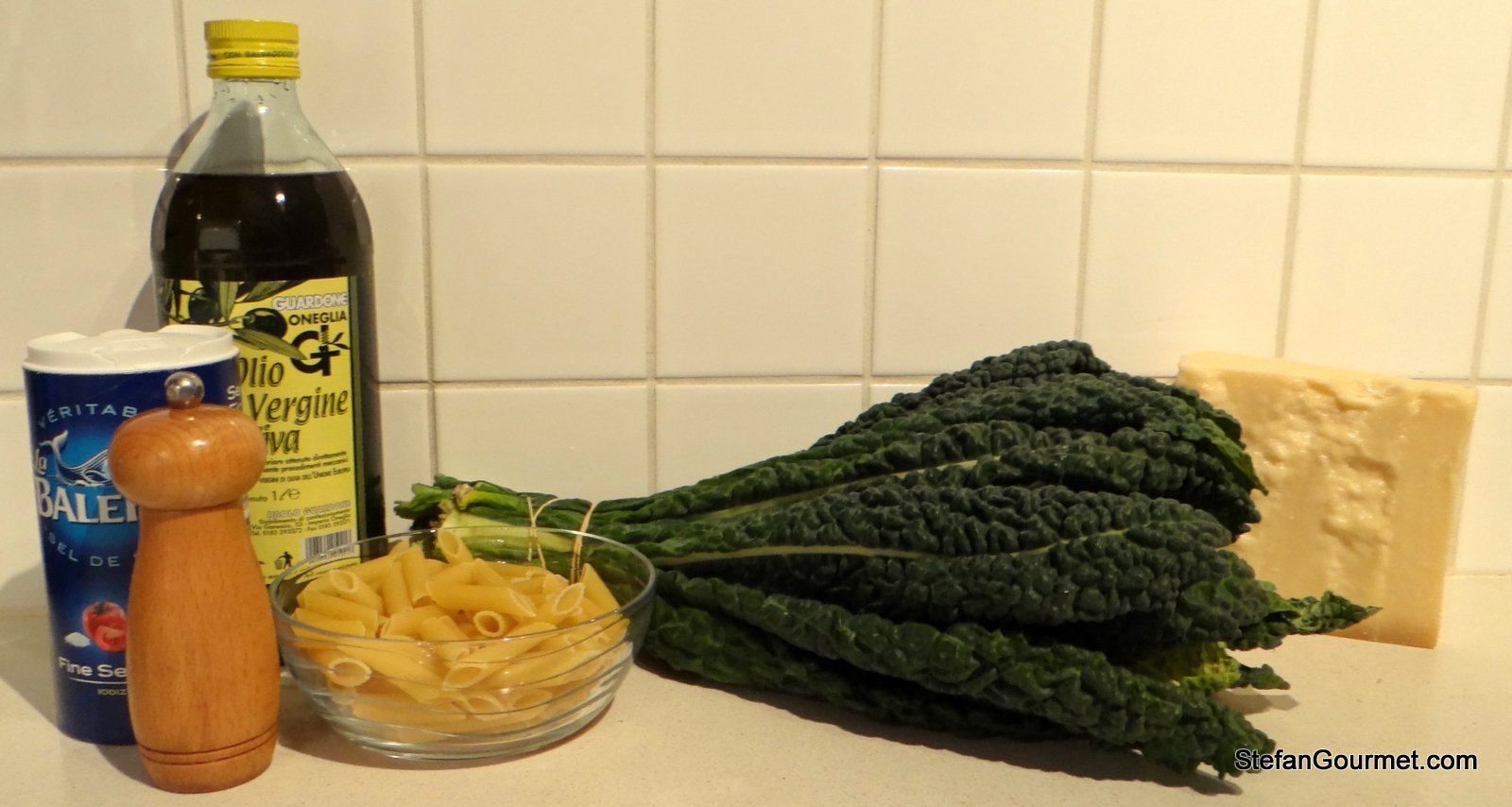 Il cavolo nero è il mio tipo di cavolo preferito. Questo primo piatto è veloce, semplice e molto buono. Il cavolo nero è lessato e poi saltato in padella mentre le penne sono lessate. Per completare il piatto, il tutto è amalgamato con parmigiano e un po’ dell’acqua di cottura della pasta. Questa ‘salsa’ di acqua di cottura e parmigiano è molto cremosa e va benissimo con il sapore e la croccantezza del cavolo.