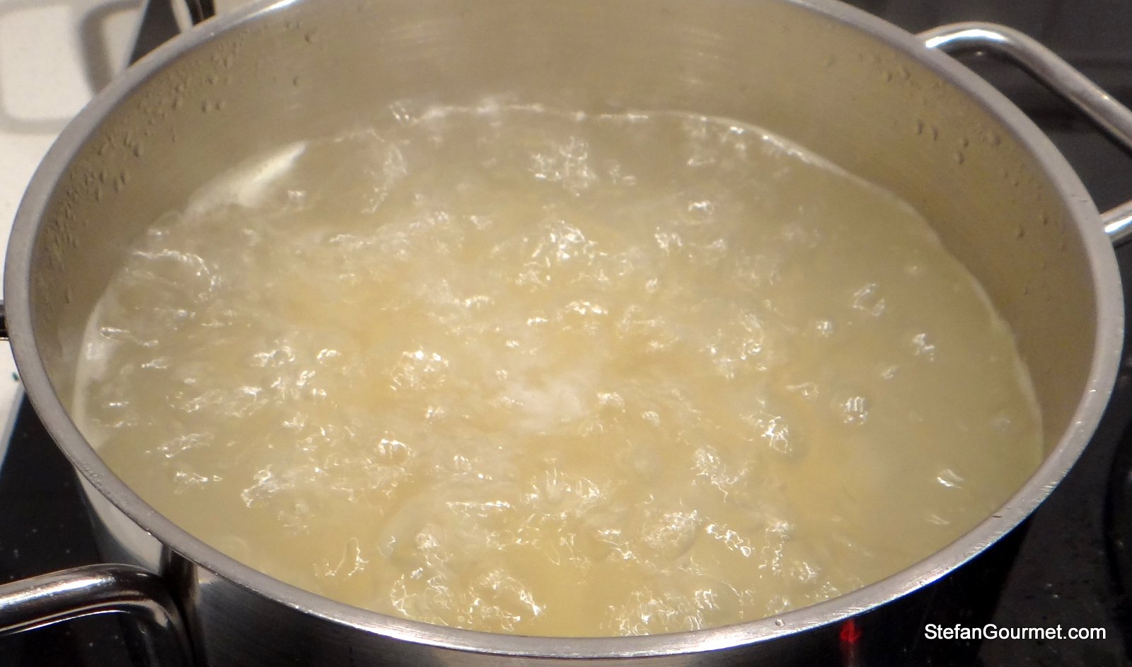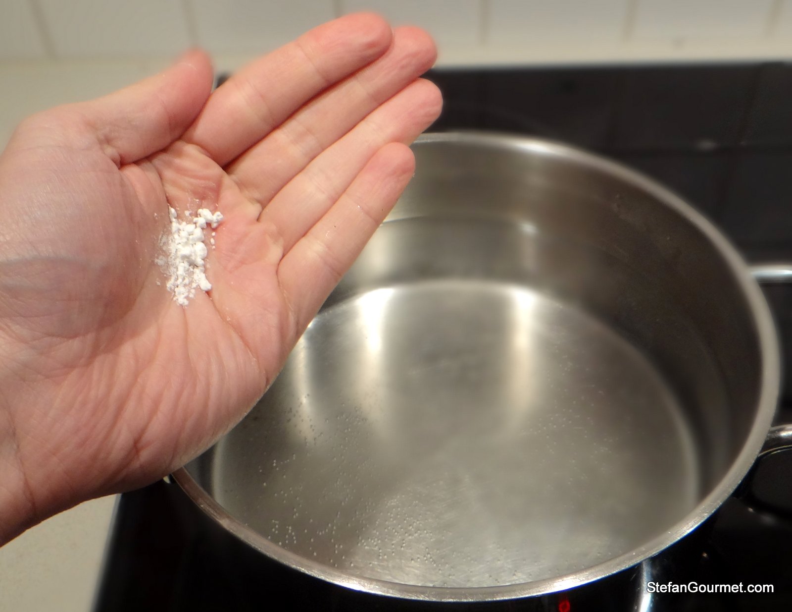 Prendete una pentola con acqua e aggiungete un pizzico di bicarbonato. Il bicarbonato rende l’acqua più basica (invece di acida) per mantenere il colore verde del cavolo. Portate l’acqua ad ebollizione mentre pulite il cavolo.