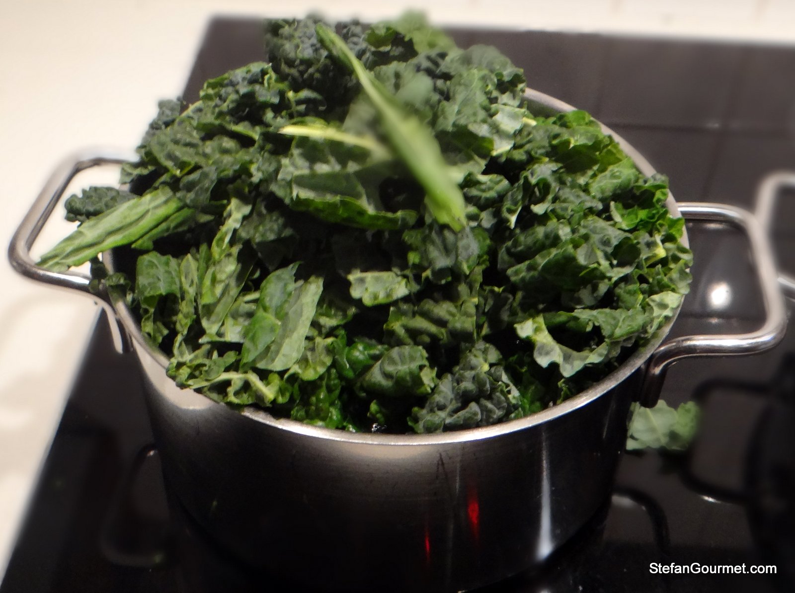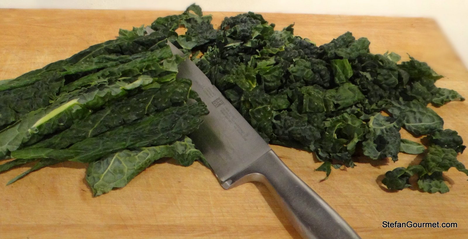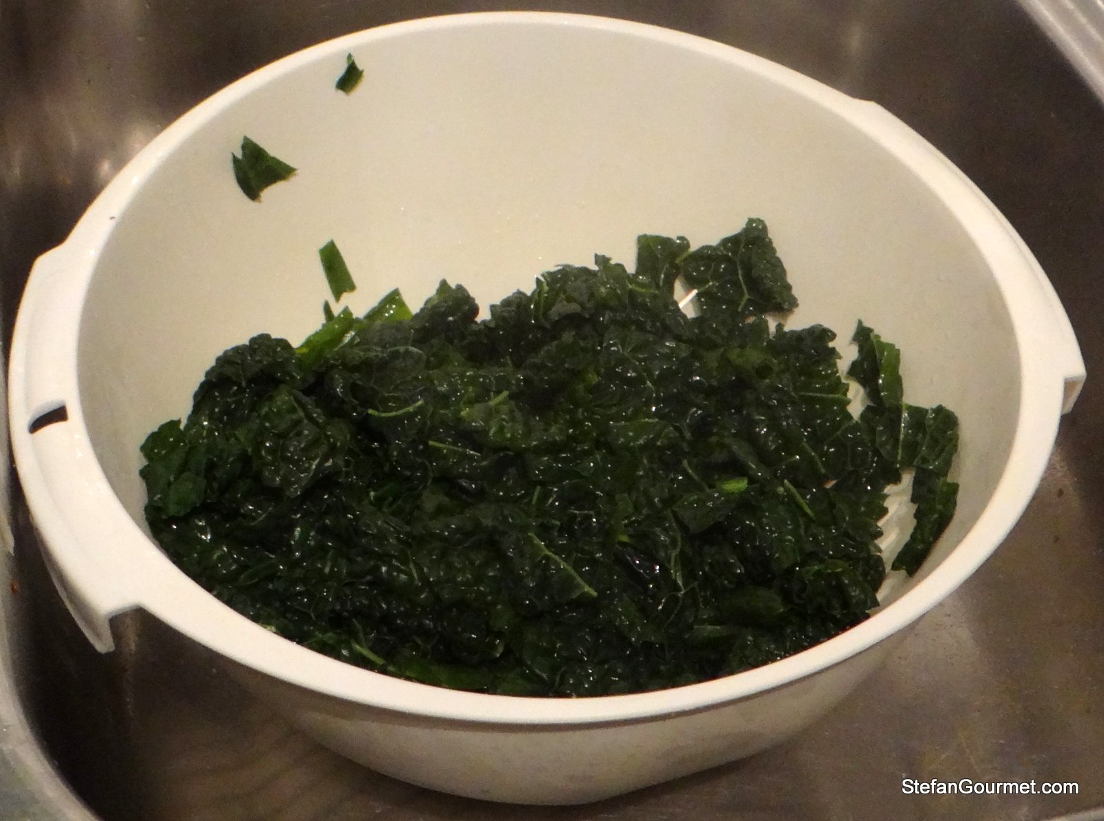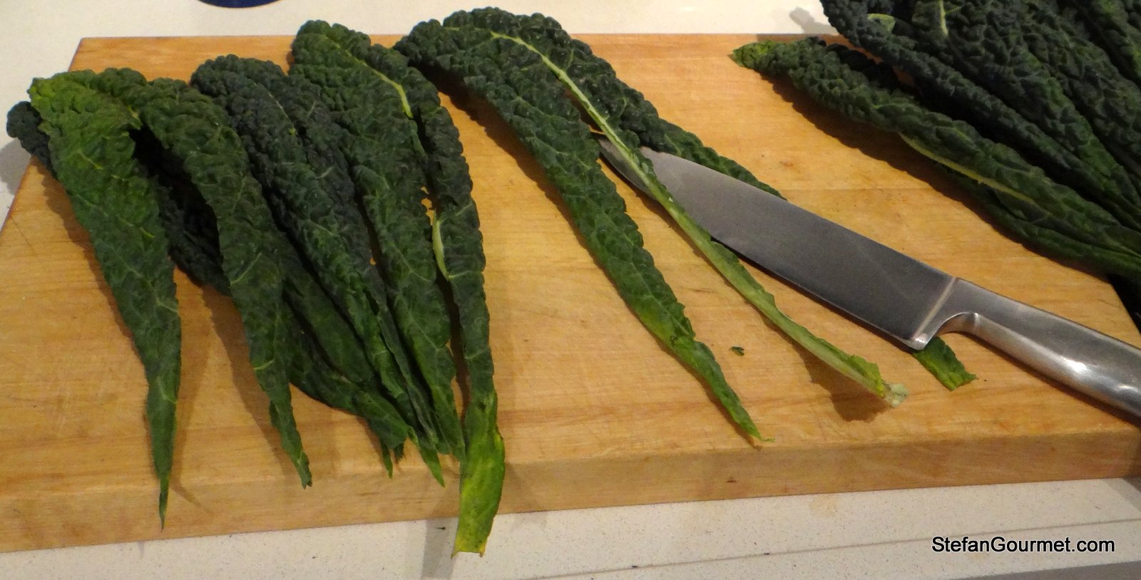 Eliminate la costa centrale da ogni foglia di cavolo nero.