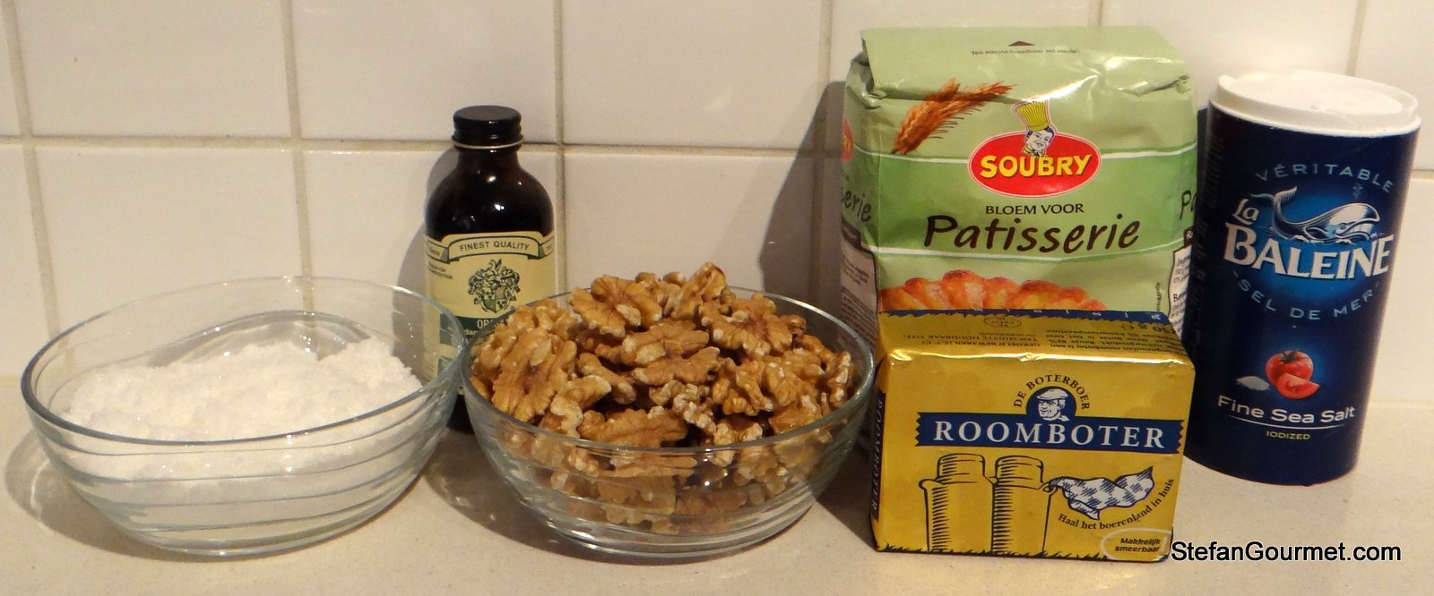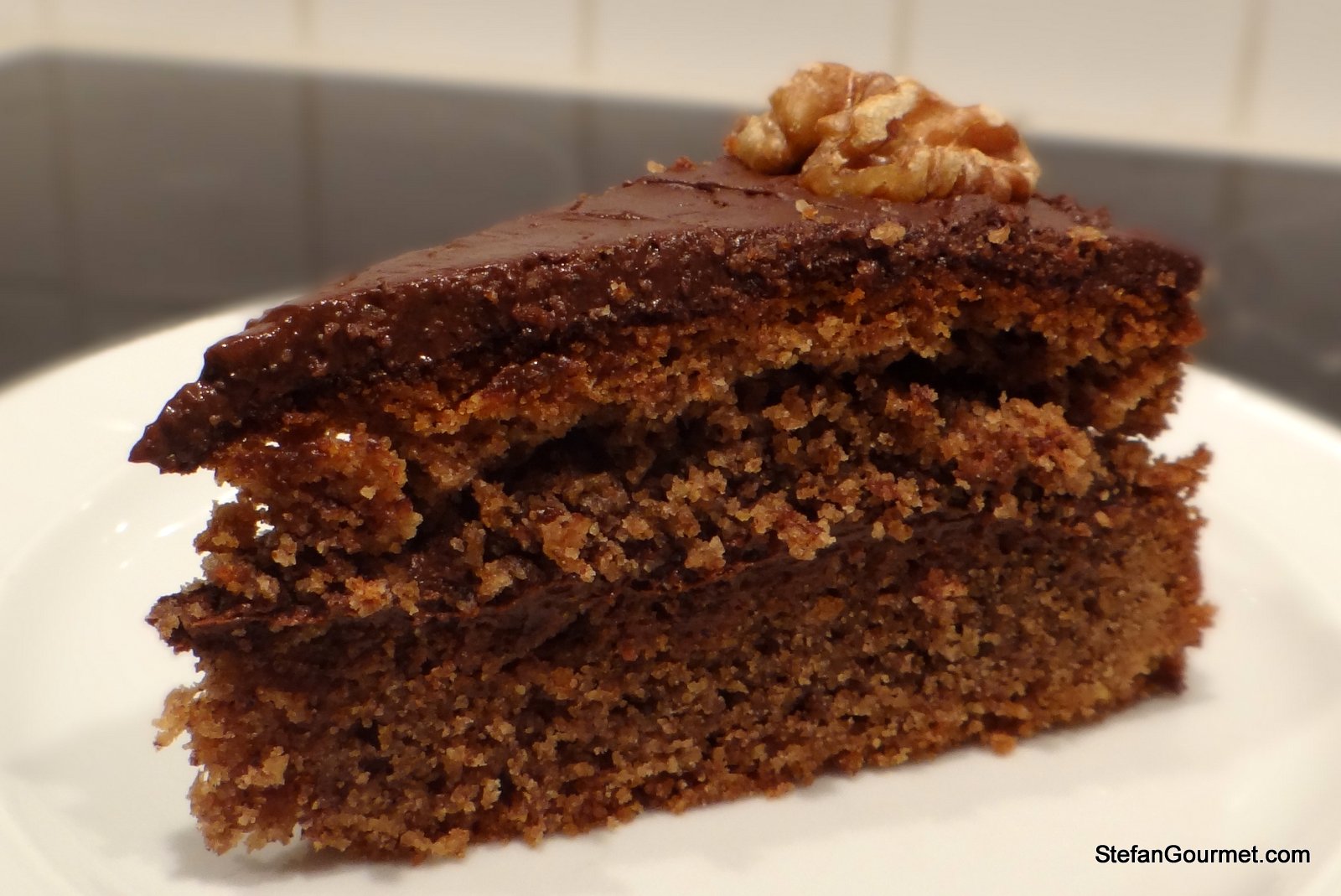 Cercavo un dessert per una cena piemontese. La mia amica piemontese Resi mi ha suggerito la torta di noci, formata da due dischi di pasta da bacio-di-dama, uniti da una crema pasticciera mescolata al cioccolato. Mi sembrava molto buona questa torta, e così avevo deciso di farla.