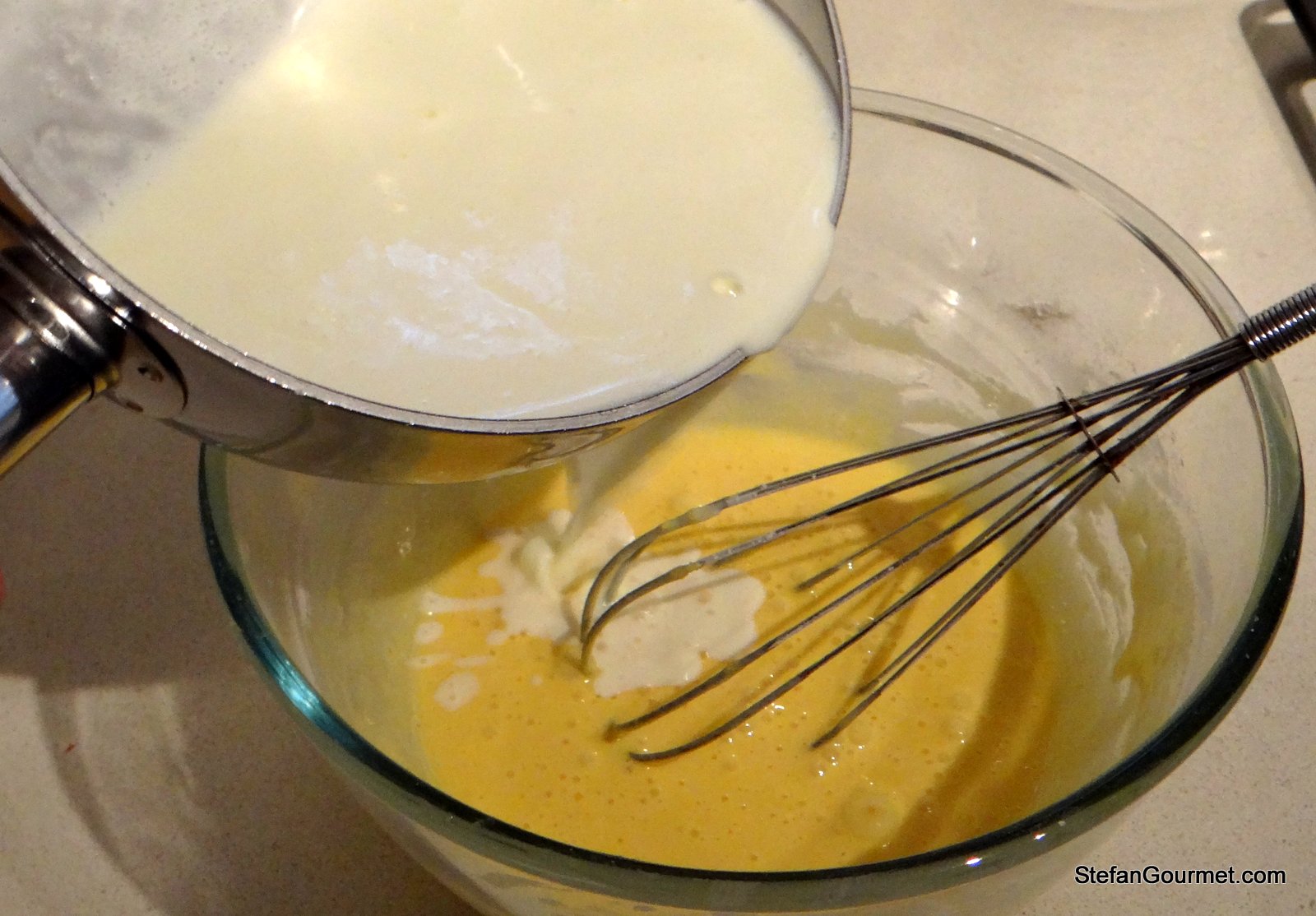 Adesso aggiungete un po’ del liquido caldissimo e mescolate per stemperare i tuorli.
