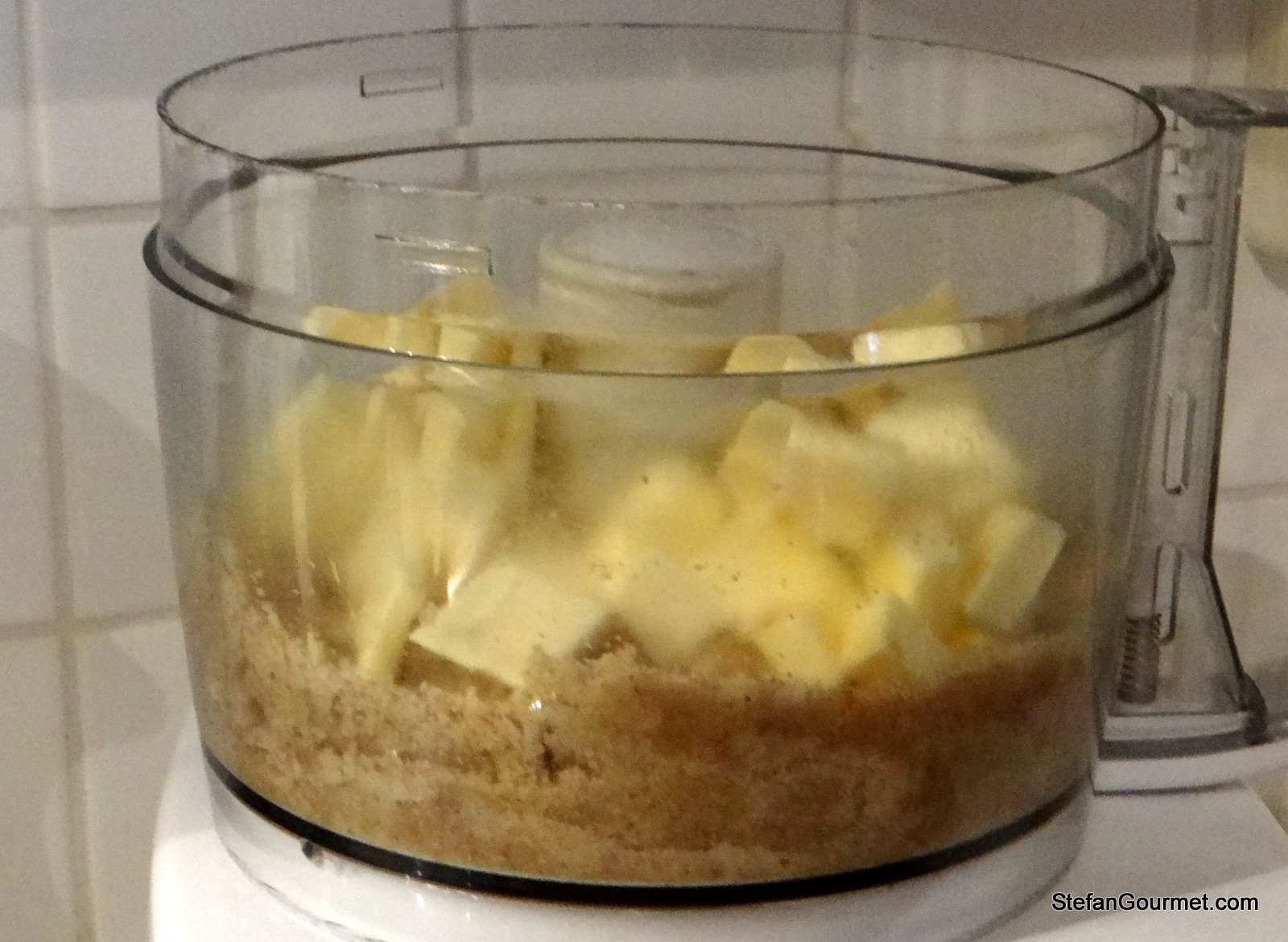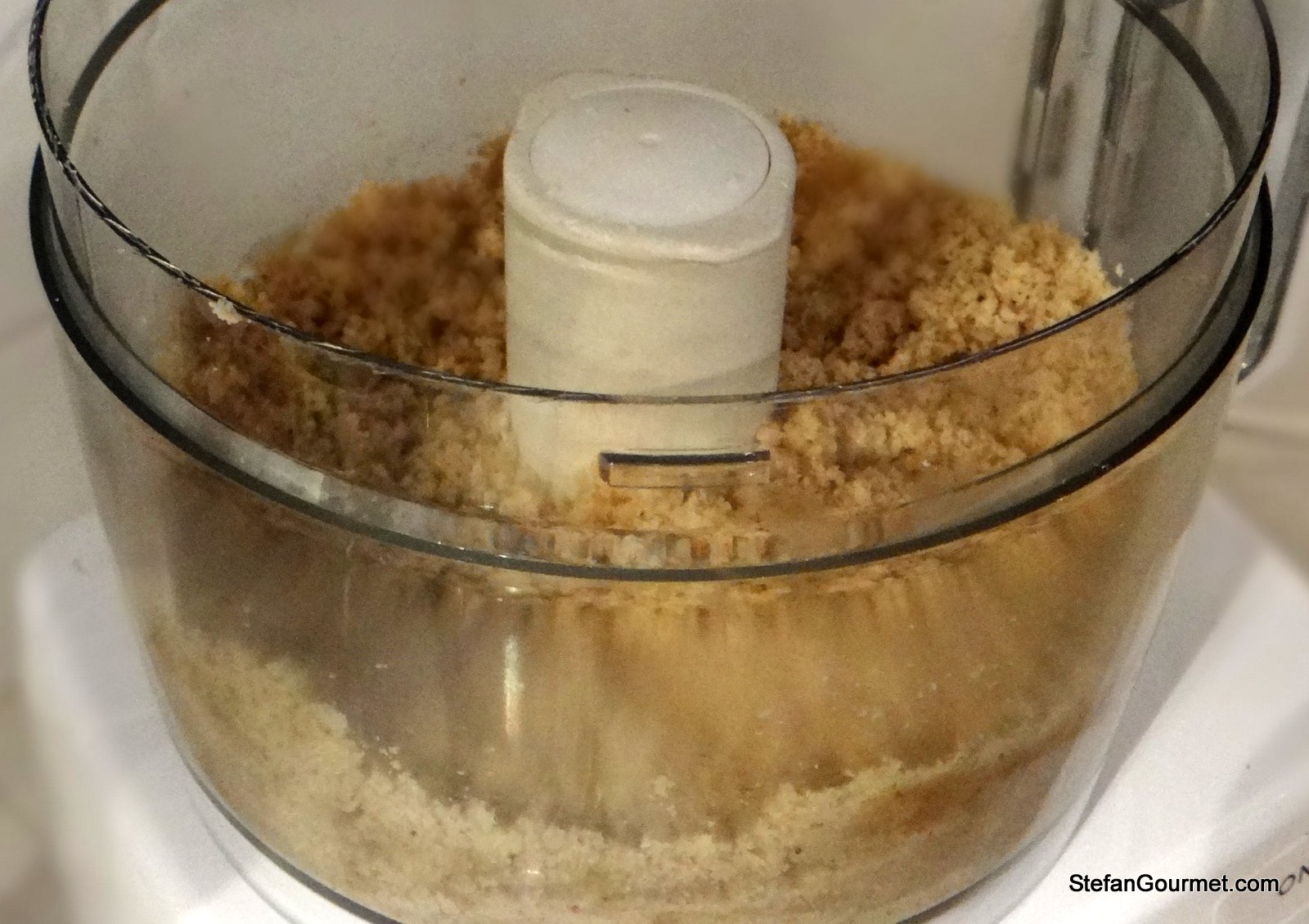 Tritate le noci rimaste con 50 grammi dello zucchero fino a quando sono fini.