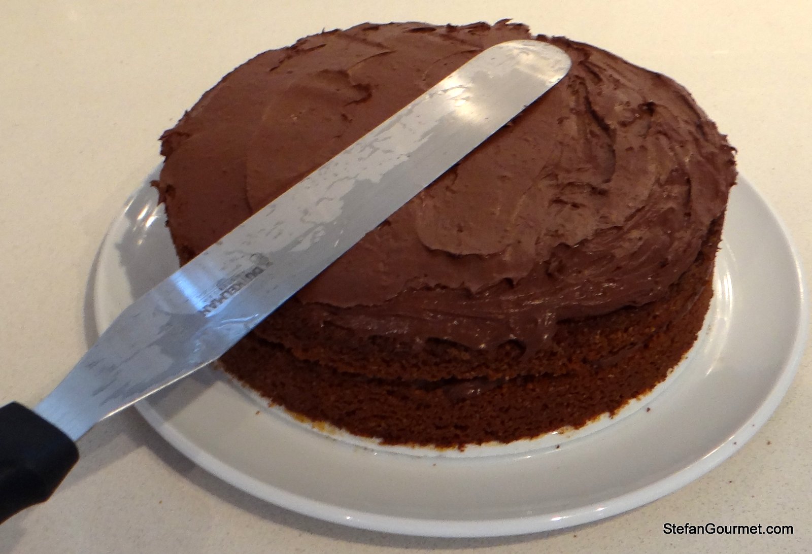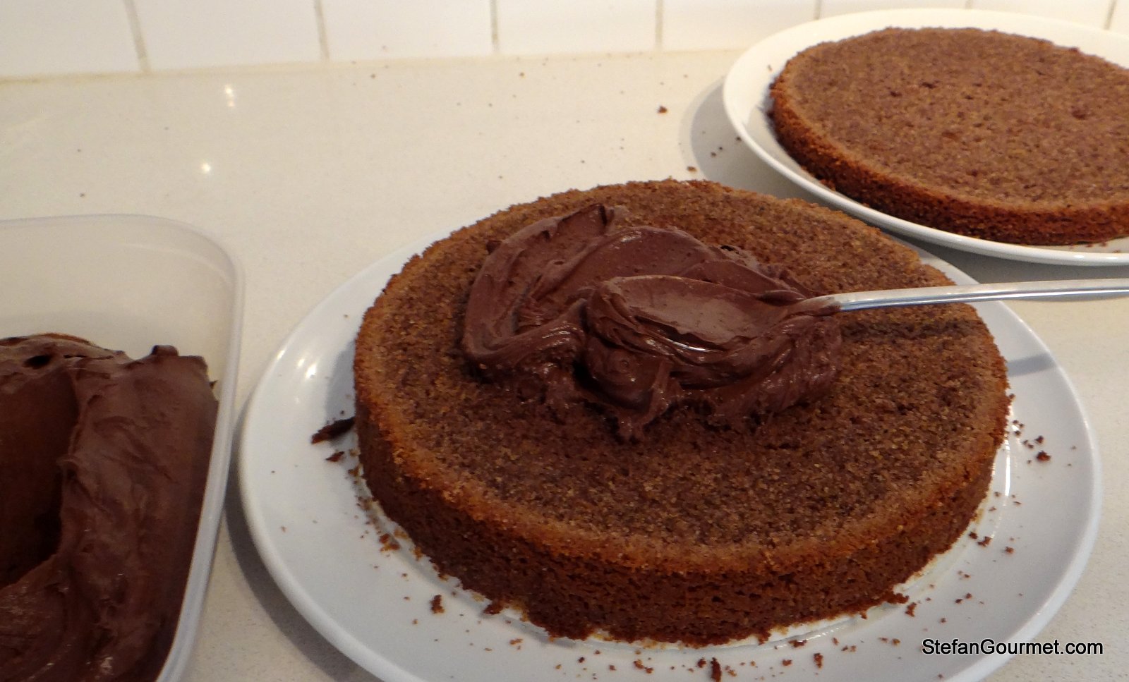 Spalmate la metà della crema di cioccolato sullo strato inferiore della torta.
